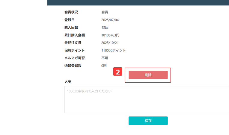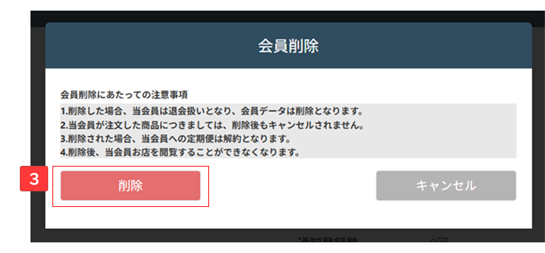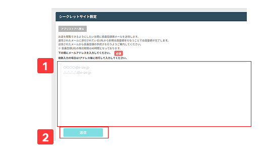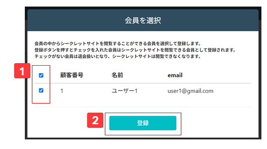 店舗で指定した会員のみショップページを閲覧できるように設定することができます。 店舗管理画面から顧客の招待・削除が可能です。 1. 初回設定 2. 招待メール送信 3. 会員メール送信履歴 4. 会員の削除 1. 初回設定(既存顧客がいる場合) 既存顧客からショップ閲覧を許可する顧客にチェックを入れます。 「登録」を押します。 2. 招待メール送信 招待するメールアドレスを入力します。複数入力する場合は改行して入力してください。 「送信」を押します。 3. 会員メール送信履歴 顧客一覧より「会員メール送信履歴」を押すと、送信履歴が確認できます。 4. 会員の削除 詳細ボタンを押します。 「削除」を押します。 「削除」を押します。